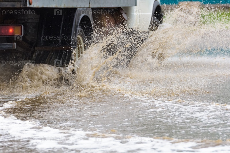 Автомобильная дождевая лужа брызгает водой