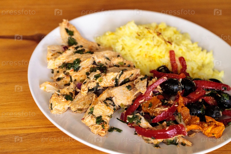 Цыпленок с кинзой, оливками, перцем, чесноком и луком