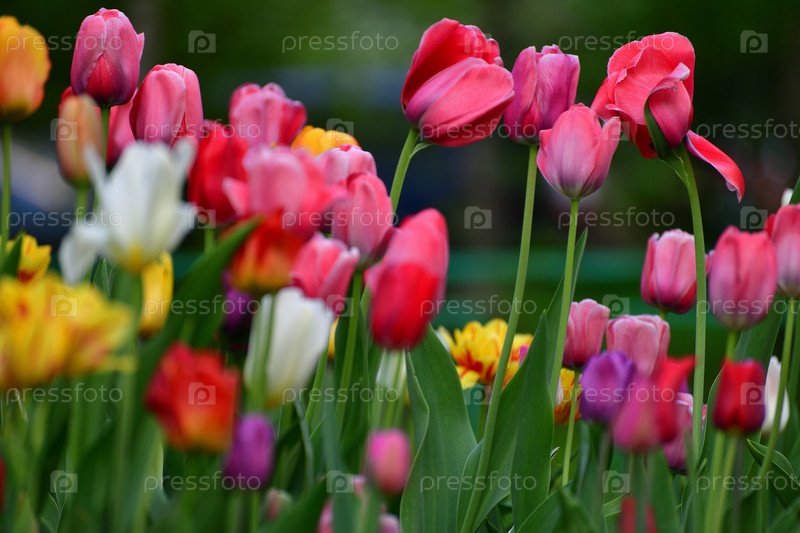 Тюльпаны разных цветов на клумбе