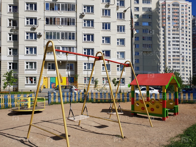 Детская площадка с качелями во дворе жилого дома в городе, Россия