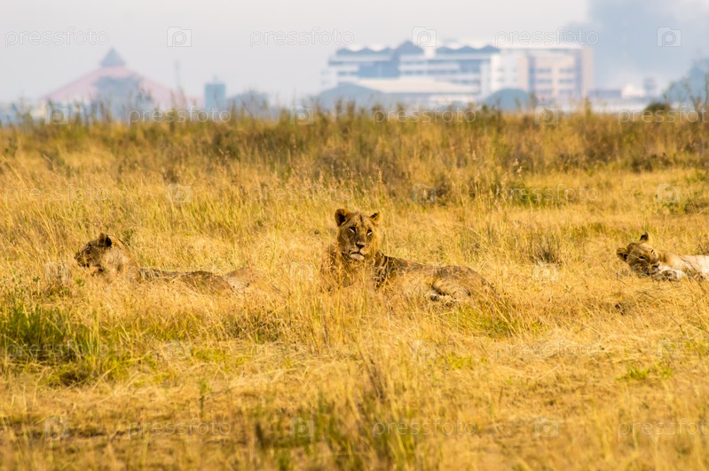 Молодой лев и львицы в саванне Найроби парк в Кении