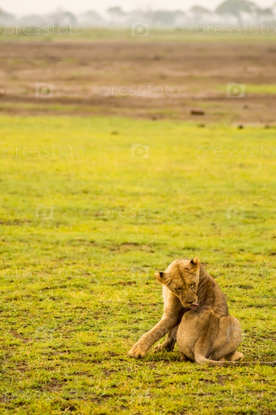 Лев в саванне Амбосели парк в Кении