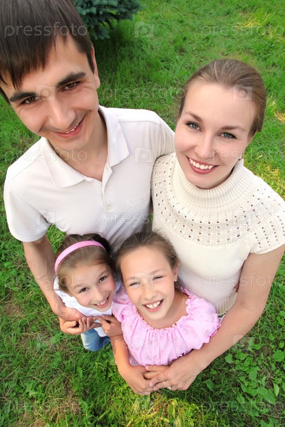 Молодая семья: мать, отец и две дочки на траве