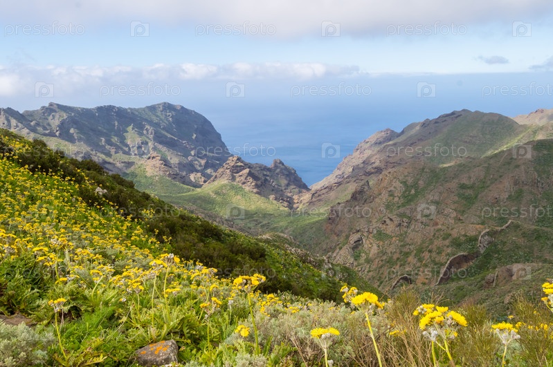 Вид долины и горы с цветами