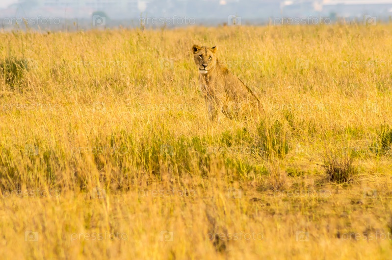 Молодой лев и львицы в саванне Найроби Парк