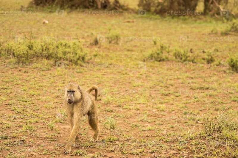 Бабуин в саванне в Амбосели Парк