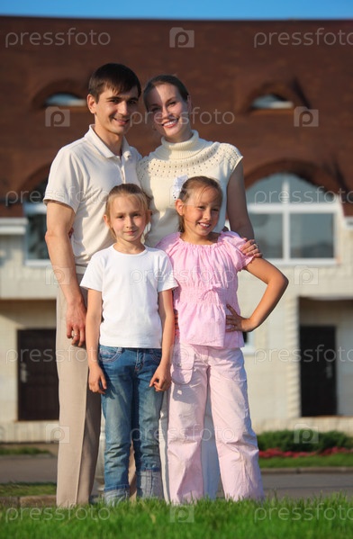 Молодая семья: мать, отец и две дочки на траве