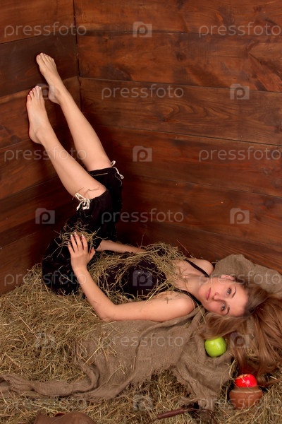Красивая улыбающаяся женщина на стоге сена на ферме