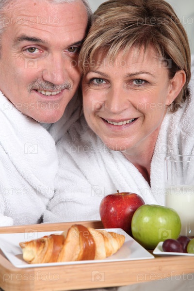 Пожилая пара завтракает в постели