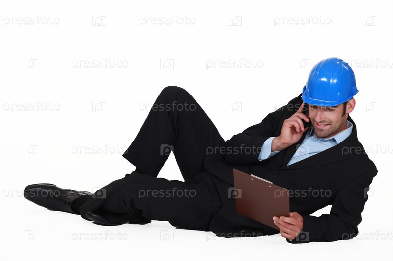 Инженер говорит по мобильному телефону, глядя на планшет
