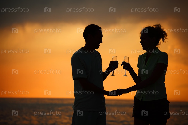 Мужчина и женщина чокаются на фоне заката