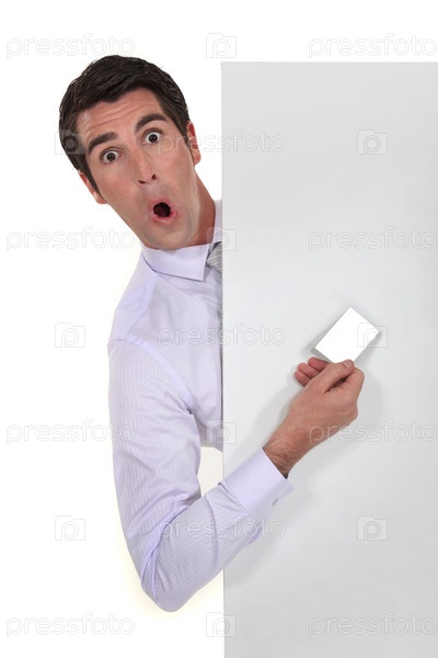 Мужчина с визитной карточкой изображает дурака