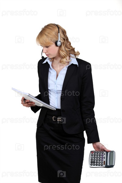 Блондинка в костюме с гарнитурой держит блокнот и калькулятор