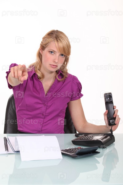 Сердитая бизнес-леди указывает пальцем в камеру