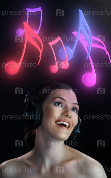 Девушка в наушниках на черном фоне
