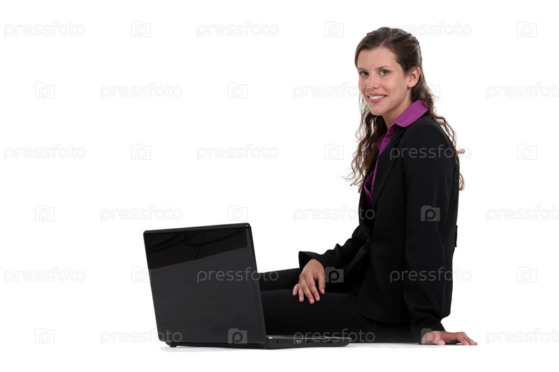 Бизнес-леди сидит на полу с ноутбуком