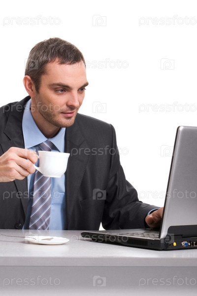 Молодой бизнесмен с чашкой в руке перед экраном ноутбука