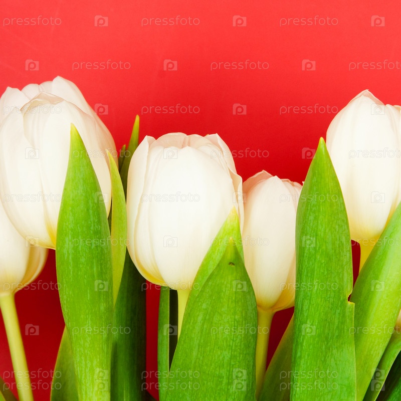 Букет из белых тюльпанов на красном фоне