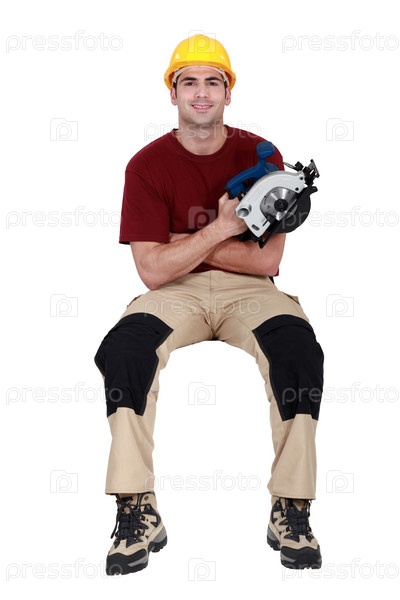 Сидящий мужчина с циркулярной пилой