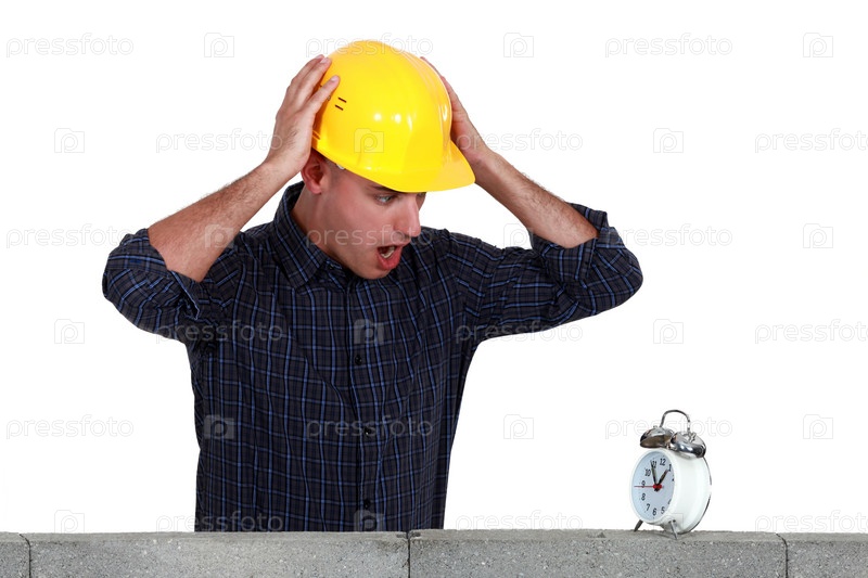 Запаниковавший строитель смотрит на будильник
