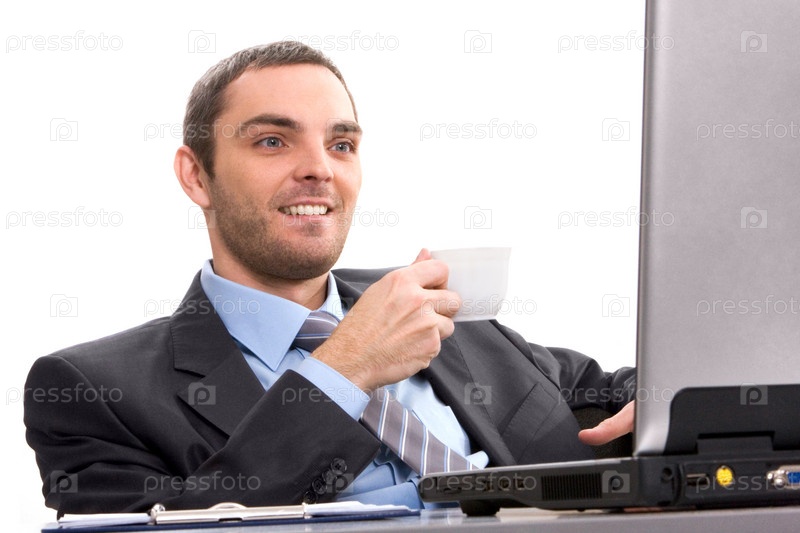 Бизнесмен с чашкой кофе смотрит в ноутбук