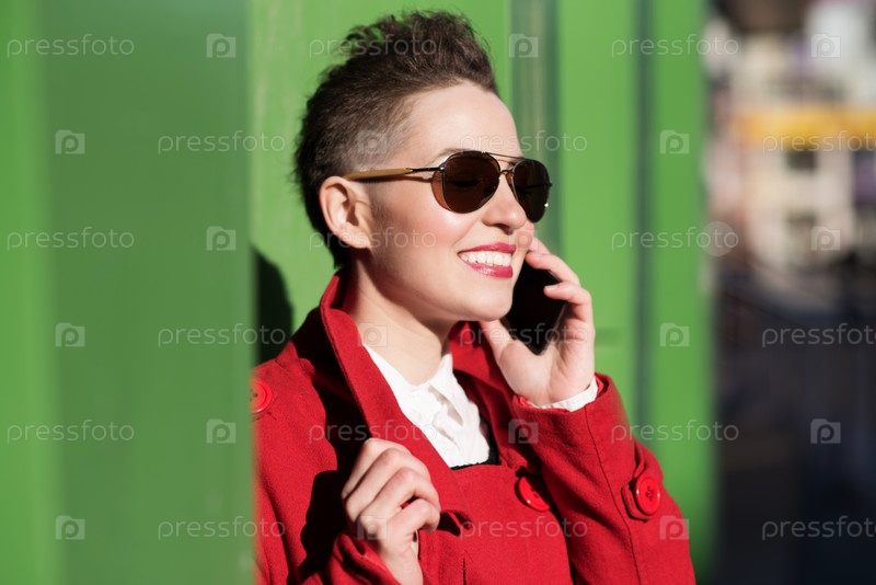 Веселая девушка разговаривает по телефону