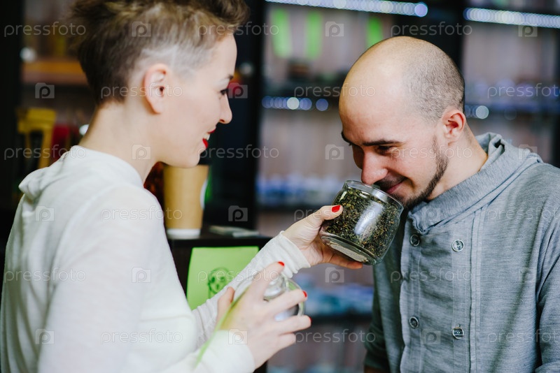 Продавец предлагает понюхать чай клиенту
