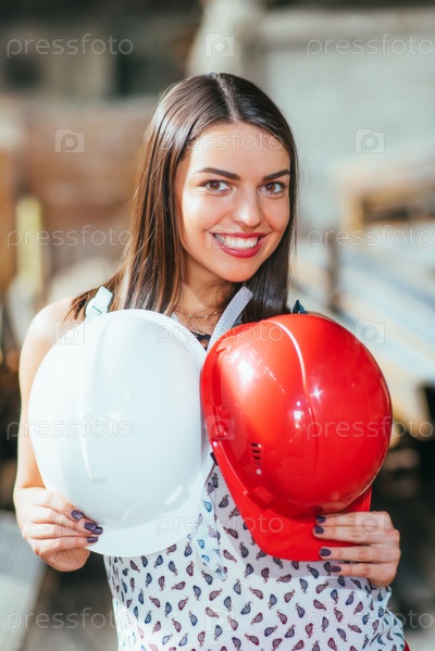 Красивая девушка на складе рекламирует товары