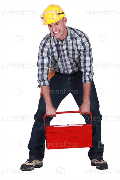 Рабочий поднимает тяжелых ящик для инструментов