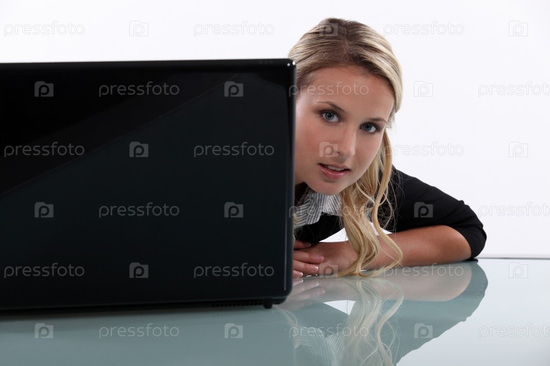 Женщина выглядывает из-за ноутбука