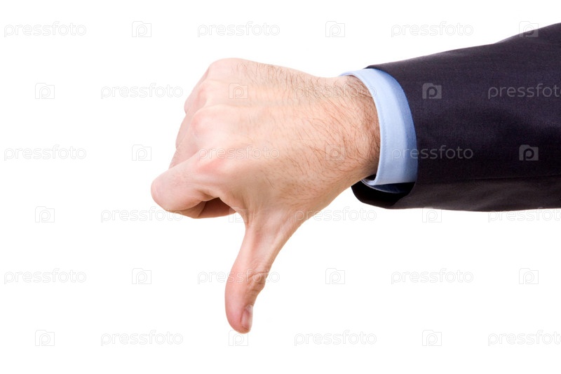 Изображение человеческой руки, показывающей большой палец вниз на белом фоне