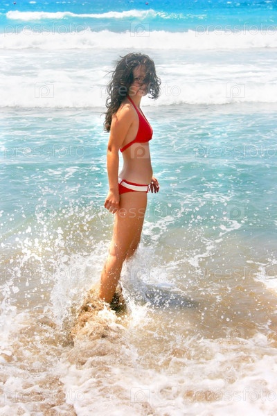 Брюнетка наслаждается морским прибоем