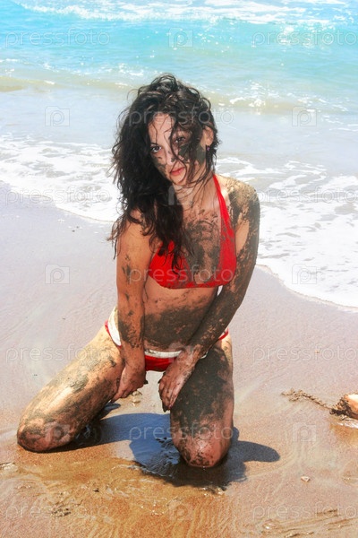 Измазанная песком девушка на пляже