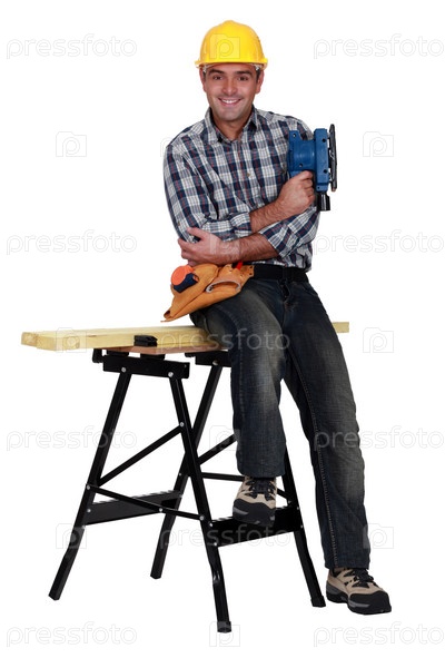 Рабочий, сидящий на верстаке