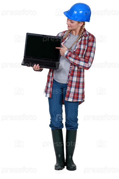 Женщмна-строитель, указывает на ноутбук