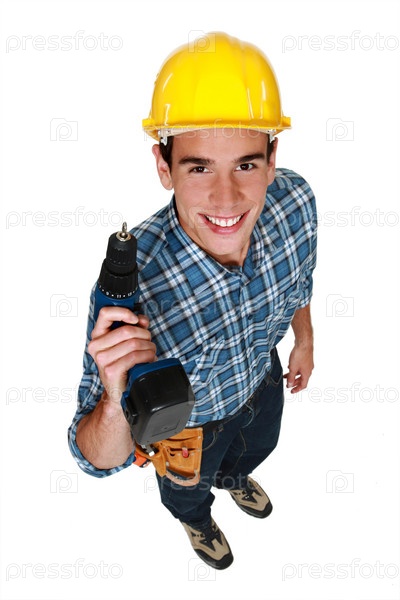 Плотник стоит с дрелью
