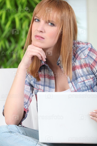 Рыжеволосая девушка сидит на диване с ноутбуком
