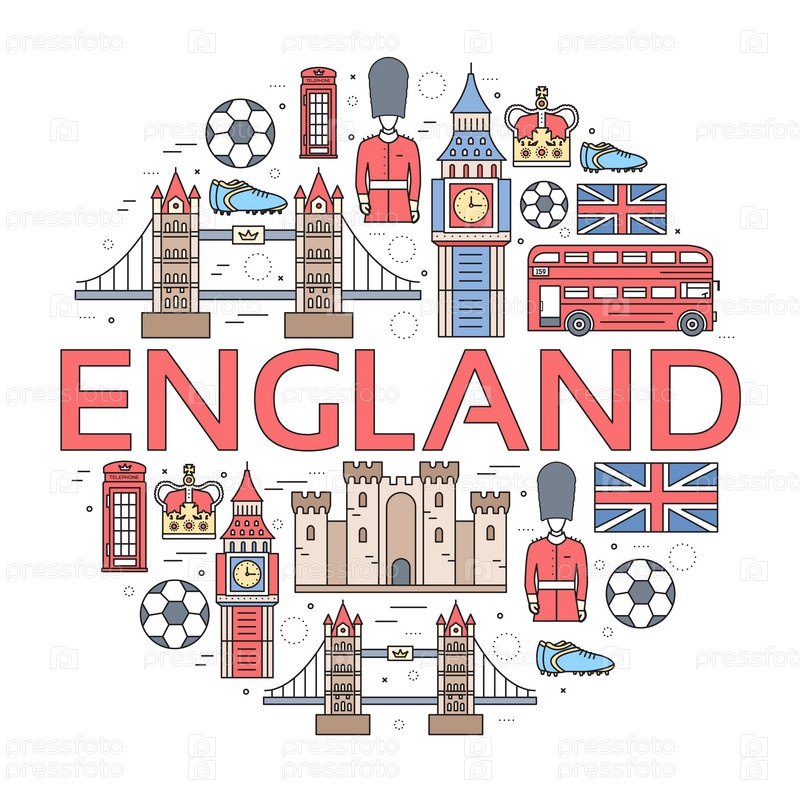 Страна Англия путешествие отпускное руководство по товарам, места в тонких линиях стильный дизайн. Набор архитектуры, людей, спорта, значков фоновой концепции. Инфографический шаблон для веб и мобильных устройств на векторной плоскости