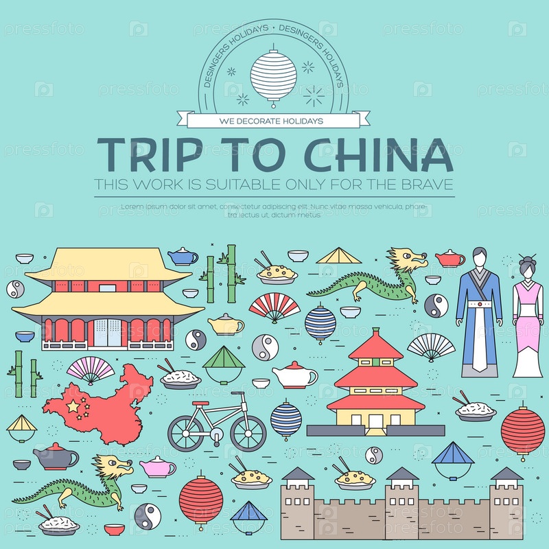 Страна Китай путешествие отпускное руководство по товарам, местам в тонких линиях стильный дизайн. Набор архитектуры, моды, людей, концепции фона природы. Инфографический шаблон для веб и мобильных устройств на векторной плоскости