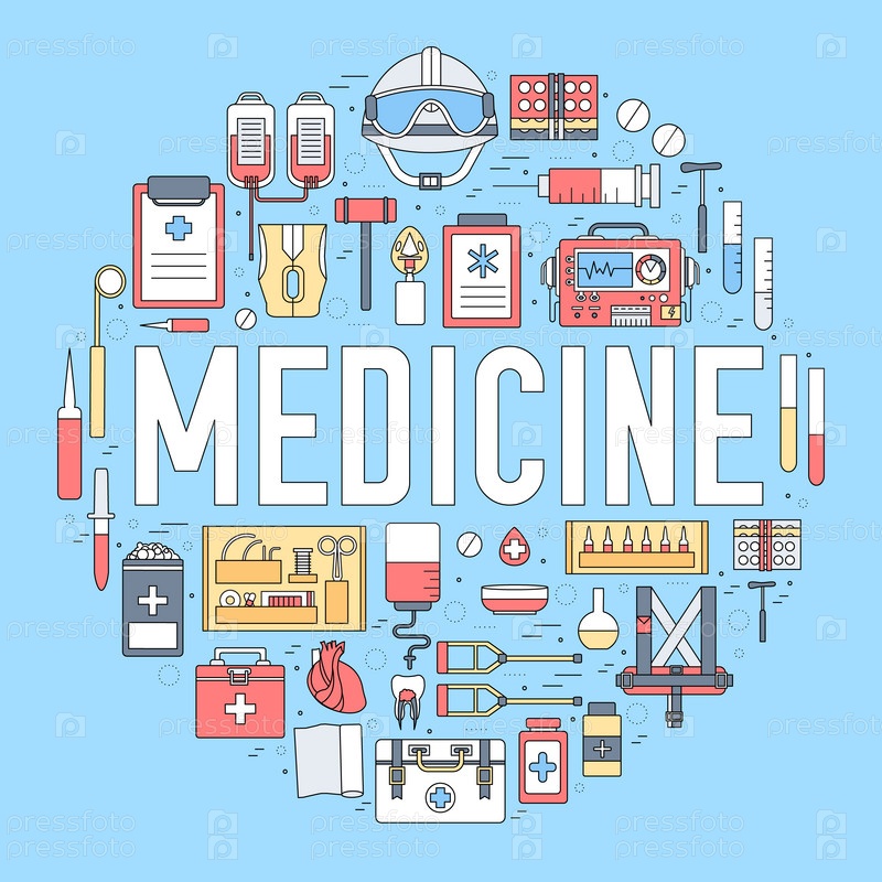 Тонкая линия первой медицинской помощи современная концепция иллюстрации. Инфографический путь от аптечки до экупатора. Иконки на изолированном белом фоне. Плоский векторный шаблон дизайна для веб- и мобильного приложения