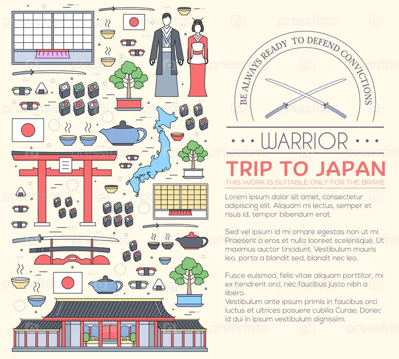 Страна Япония путешествие отпускное руководство по товарам, местам и особенностям. Набор архитектуры, моды, людей, предметов, концепции фона природы. Инфографический шаблон дизайна для веб-сайта и мобильных устройств на тонких линиях