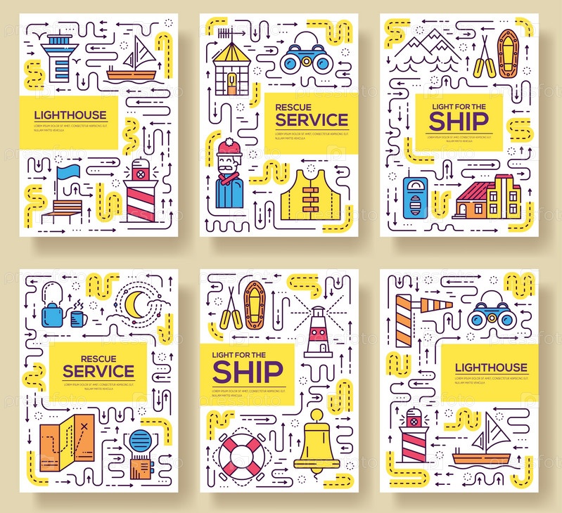 Тонкая линия здания маяка брошюра карточный набор. Работающая светящаяся ночью в океаническом шаблоне флайера, журналов, плаката, обложки книг, баннеров. Концепция приглашения конспект