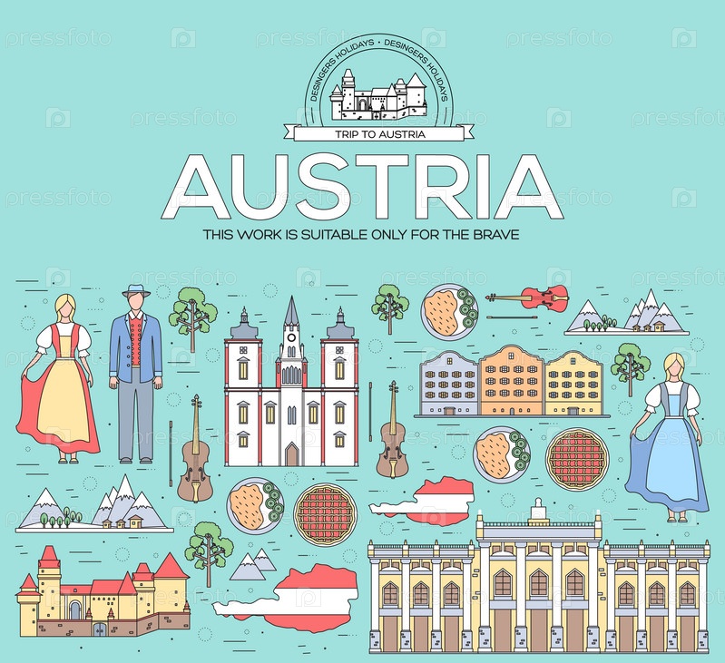 Страна Австрия путешествие отпускное руководство по товарам, местам и особенностям. Набор архитектуры, людей, культуры, концепции фона значков. Инфографические шаблоны для веб-дизайна и мобильных устройств. На тонких линиях стиль