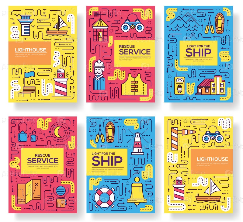 Тонкая линия здания маяка брошюра карточный набор. Работающая светящаяся ночью в океаническом шаблоне флайера, журналов, плаката, обложки книг, баннеров. Концепция приглашения конспект