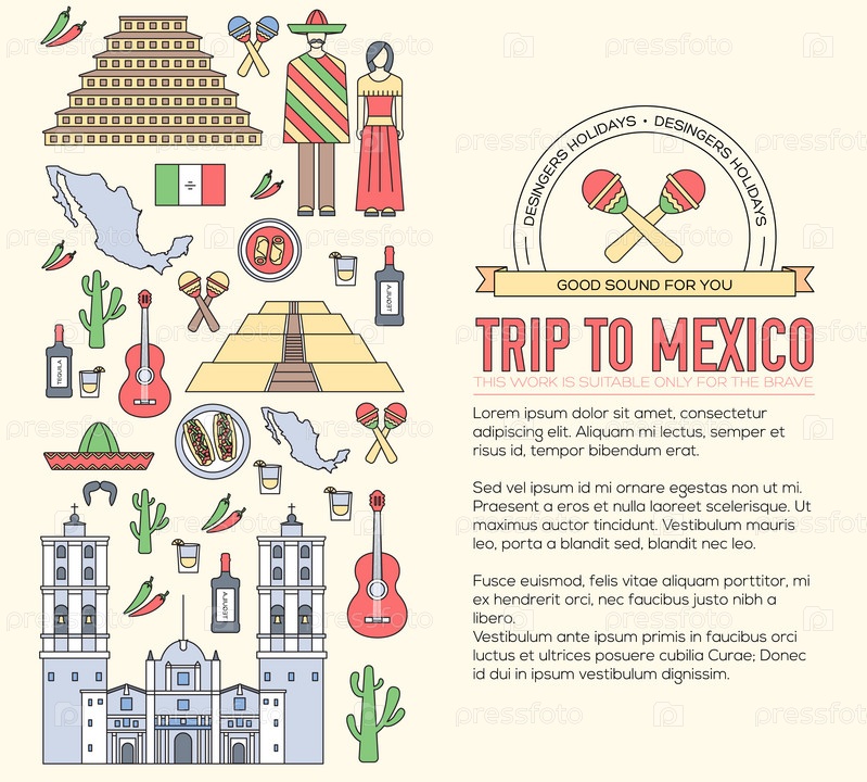 Страна Мексика путешествие отпускное руководство по товарам, местам и особенностям. Набор архитектуры, еды, моды, предметов, концепции фона природы