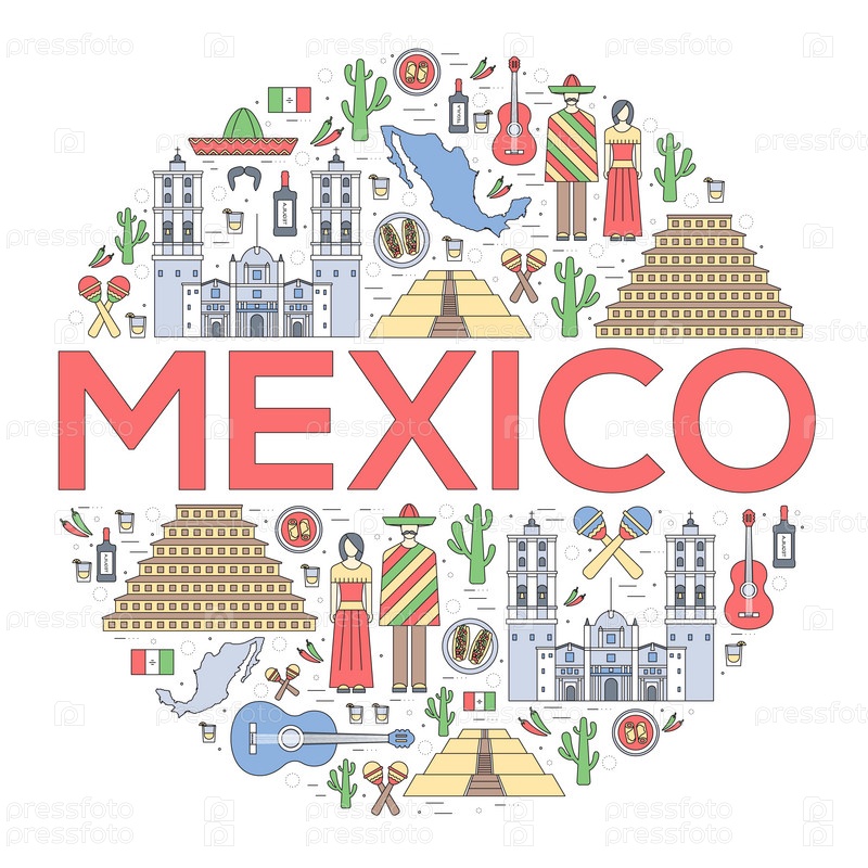 Страна Мексика путешествие отпускное руководство по товарам, местам и особенностям. Набор архитектуры, еды, моды, предметов, концепции фона природы