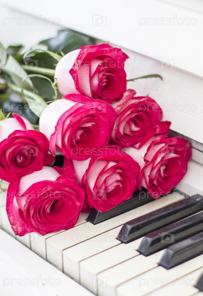 Букет красных роз и клавиш фортепиано