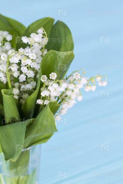 Лилии долины на бирюзовом деревянном фоне Букет лилий долины
