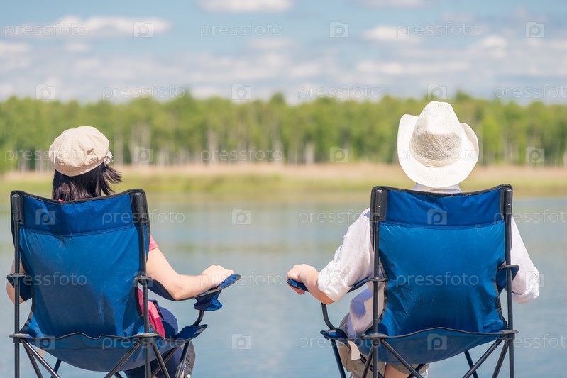 Любящая пара, сидящая на стульях возле красивого озера на пирсе