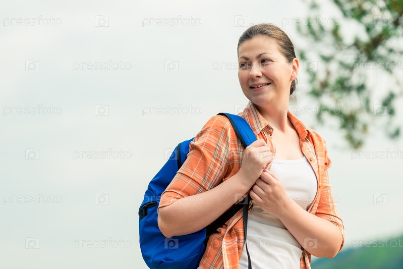Портрет туриста с рюкзаком на природе во время похода